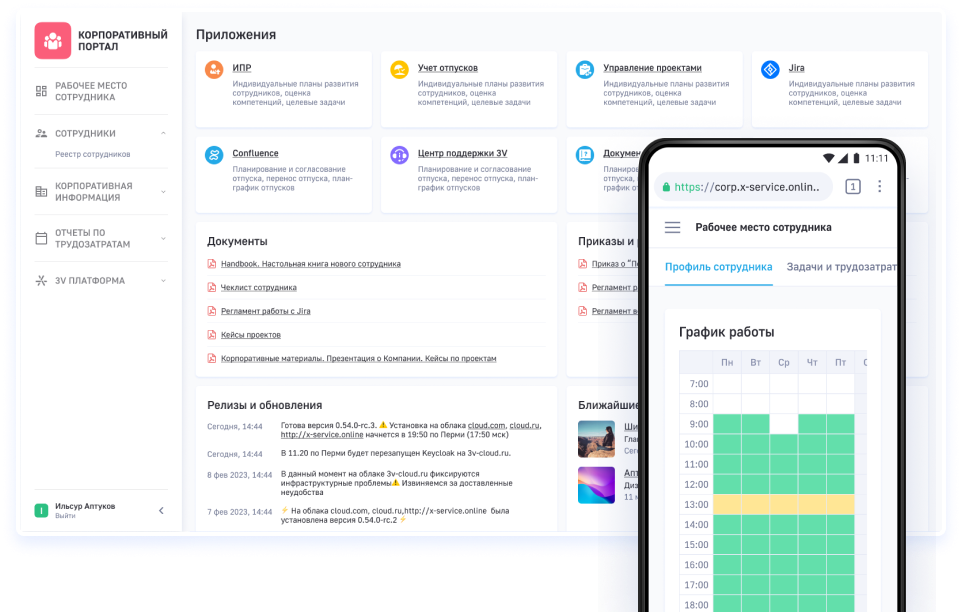 The 3V platform allows you to create an individual account for each employee, where he can access colleagues' personal data, a registry of documents/projects, information about his development plan, and other helpful information